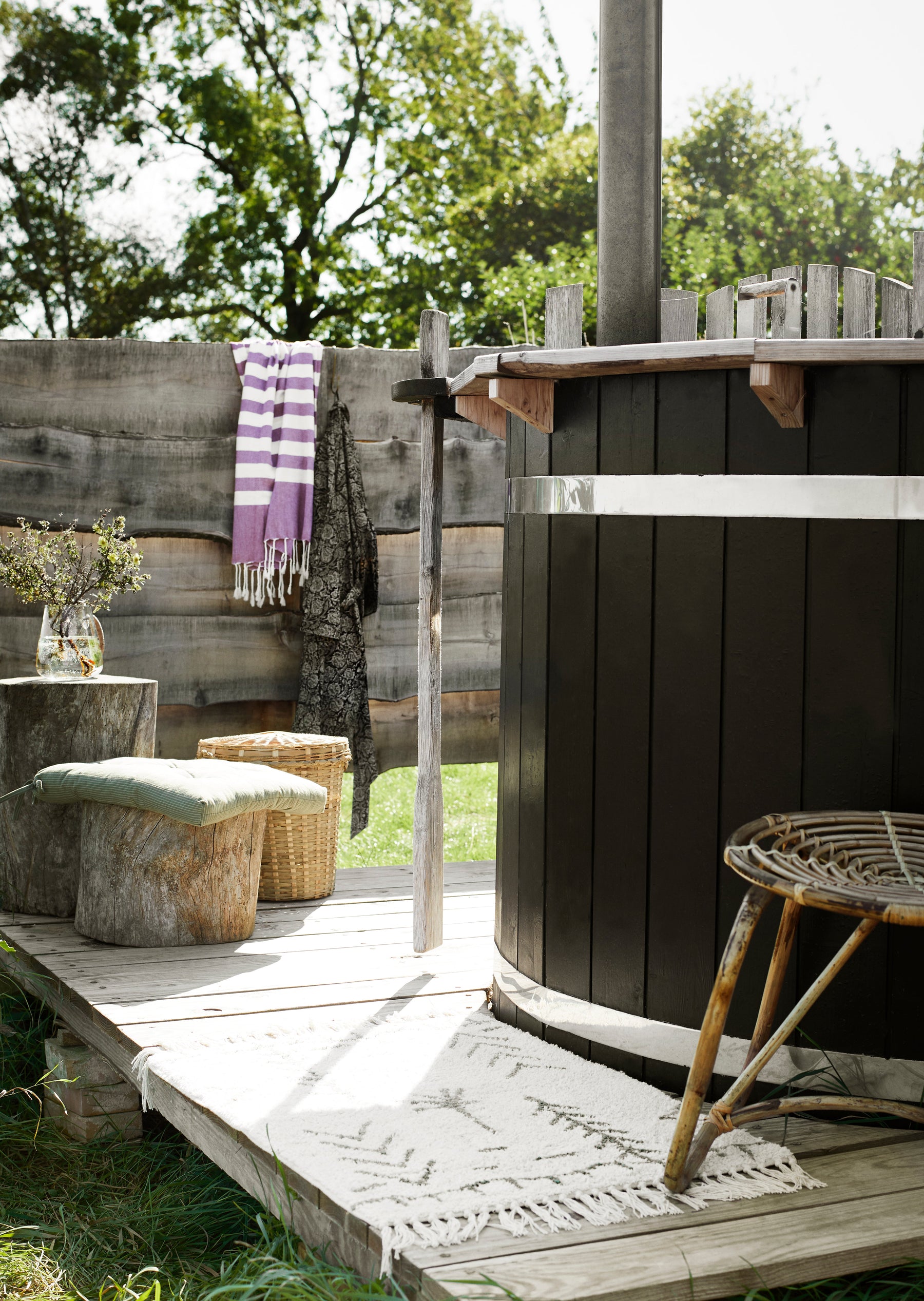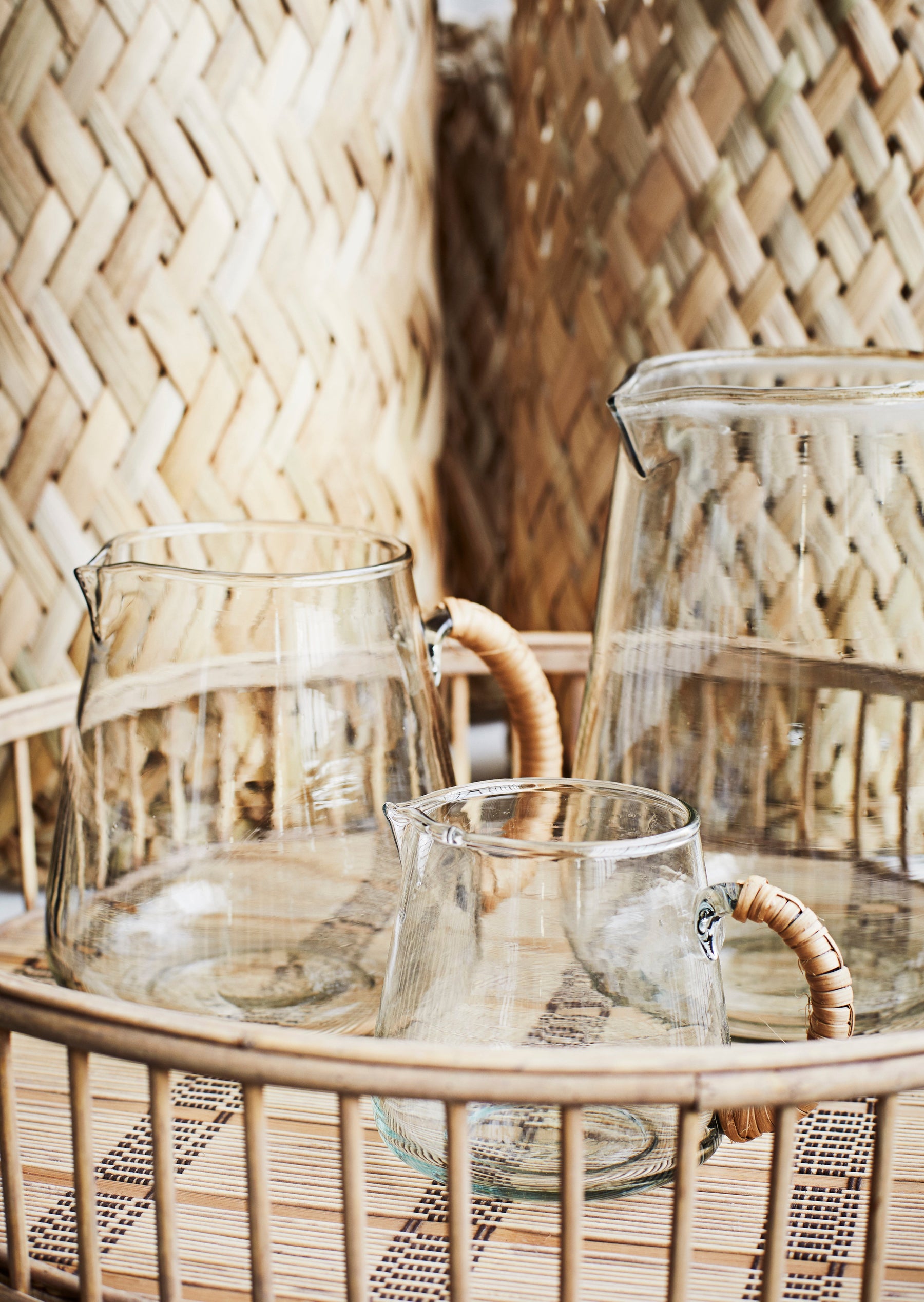 Jarra de vidrio con asa envuelta en fibra de bambú con capacidad para 2 litros.