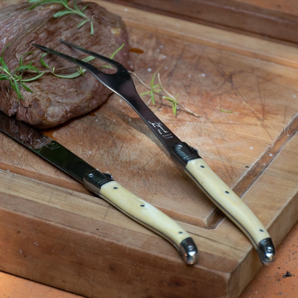 Set asado color mármol en la tradicional caja de madera que caracteriza los cubiertos que provienen de la zona de Laguiole.