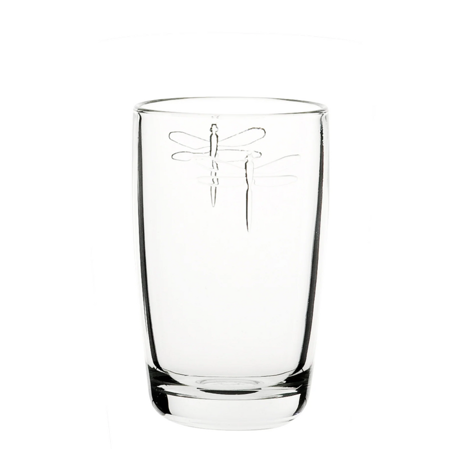 Líneas limpias, libélulas danzantes y una base perfectamente ponderada le dan a este vaso de jugo un encanto irresistible. Este es el vaso ideal para todos los días con un alegre estilo francés.