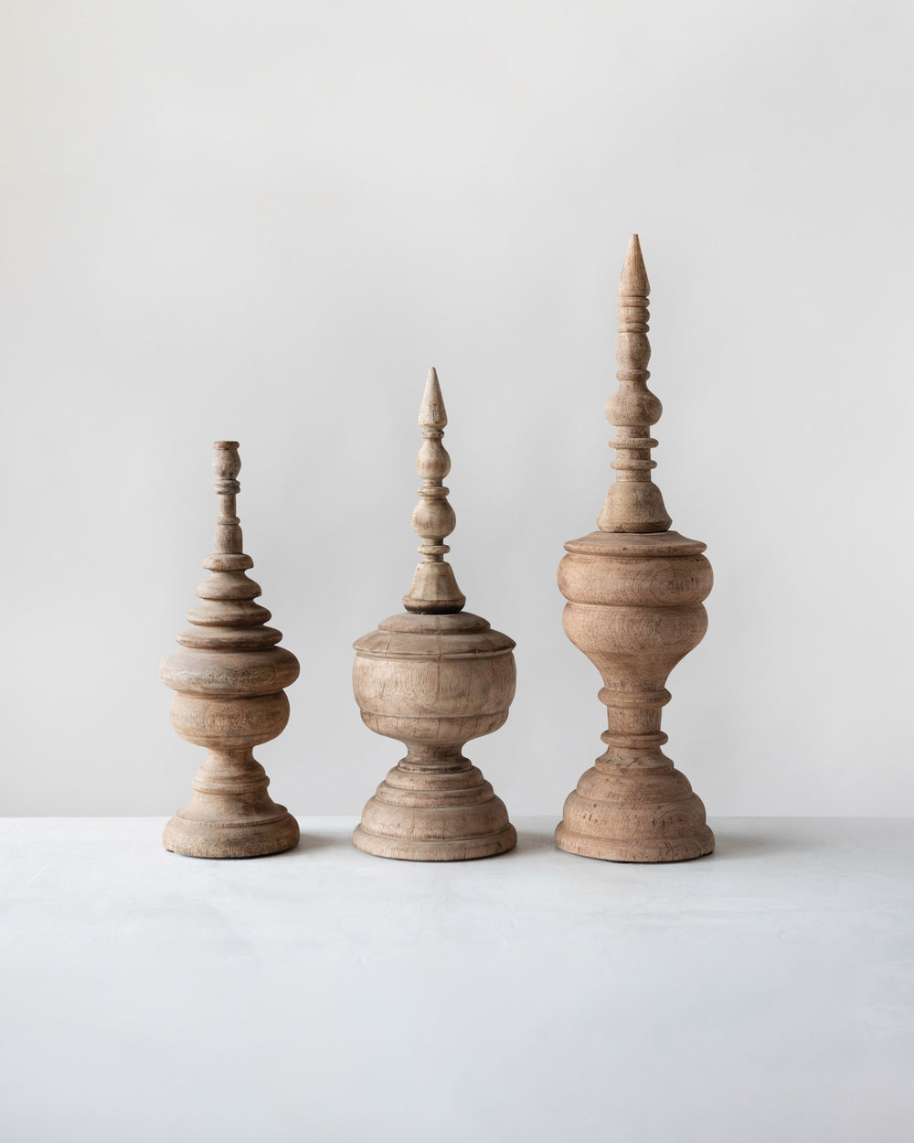 Adornos de madera tallada, perfectos parar enriquecer un espacio con calidez y sencillez. Puede usarse solo o como trio, ya que está disponible en 3 tamaños.