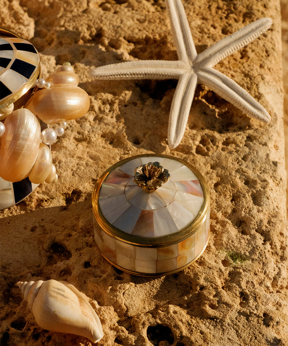 Dale un toque de elegancia a tu espacio con la Maisie Circus Box Pearly. Esta hermosa caja artesanal luce un radiante acabado perlado en blanco roto con detalles de latón, lo que la hace funcional y decorativa.