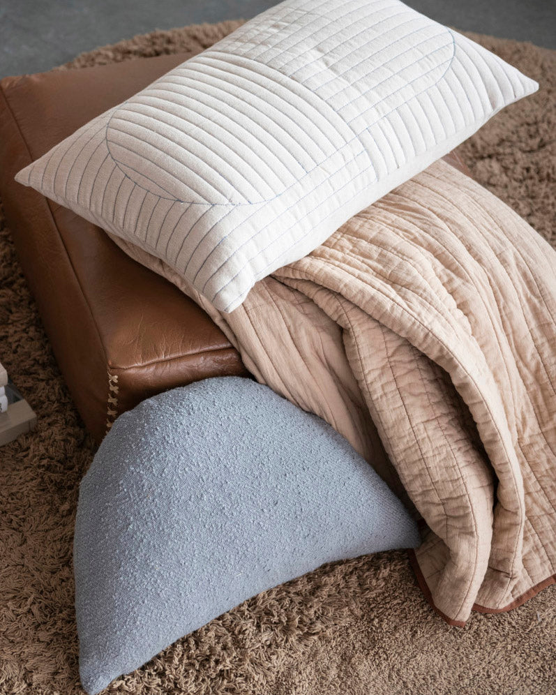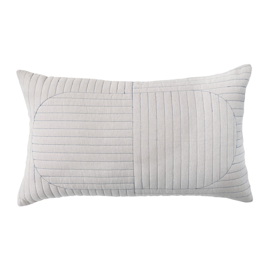 Cojín rectangular de algodón acolchado, en tono beige con figuras bordadas en tono azul.