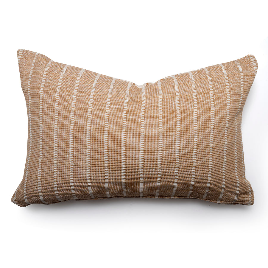 Jan Lumbar es una funda de cojín de algodón, con textura acanalada, rayado en color crudo y rayas café claro por uno de sus lados y café claro con rayas crudo por el otro. Tejido por artesanos expertos en Tailandia.