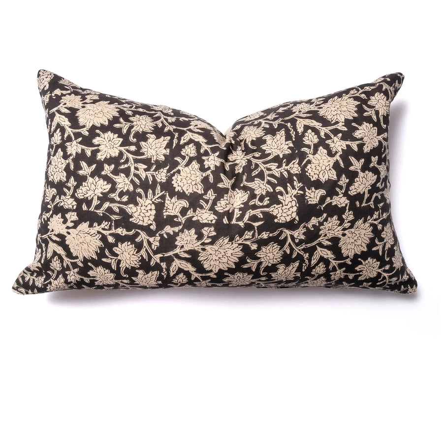 Nil Lumbar es una funda de cojín de algodón suave y ligero premium, color negro con flores crudo por ambos lados. Estampado a mano en India con técnica de bloques de madera.