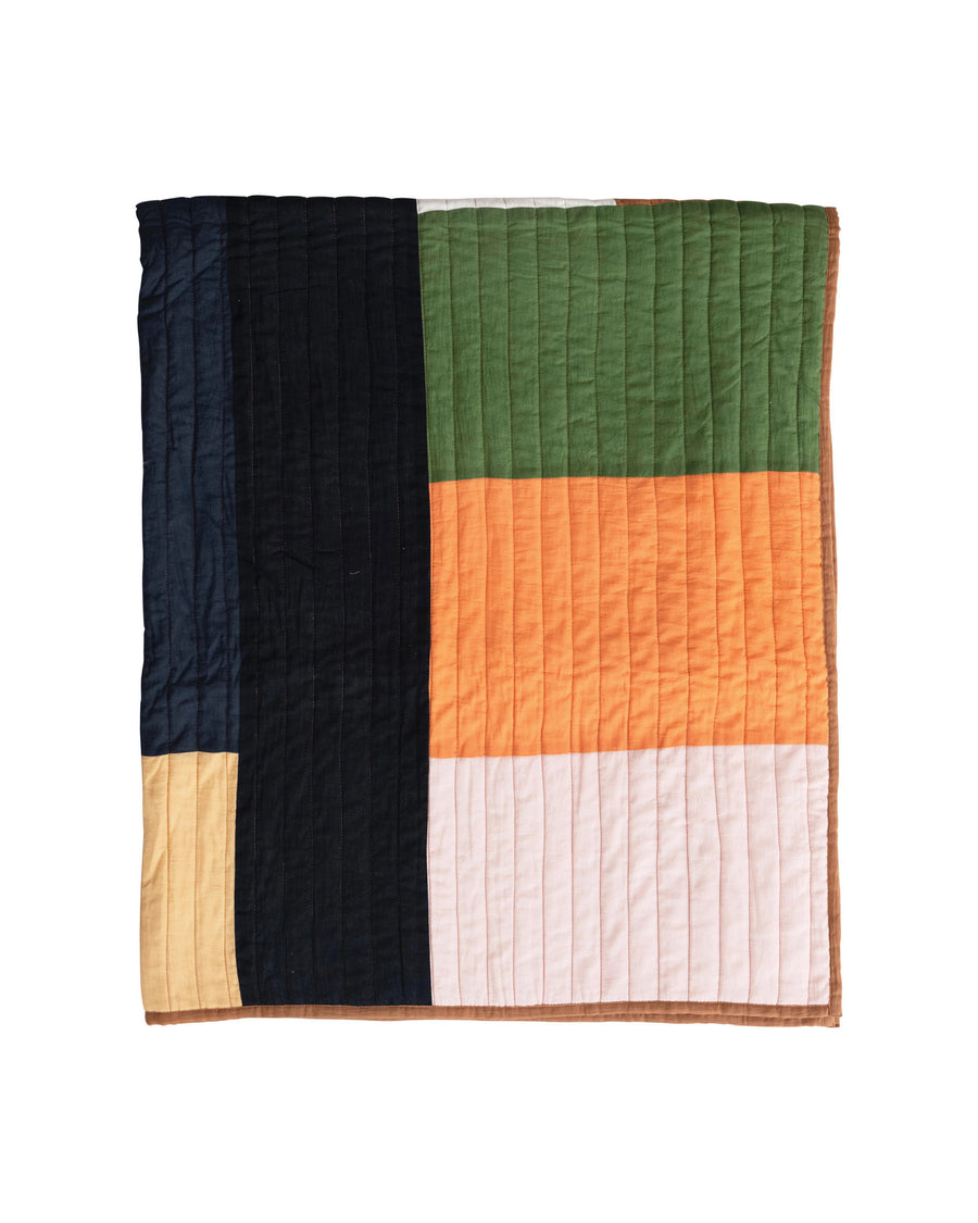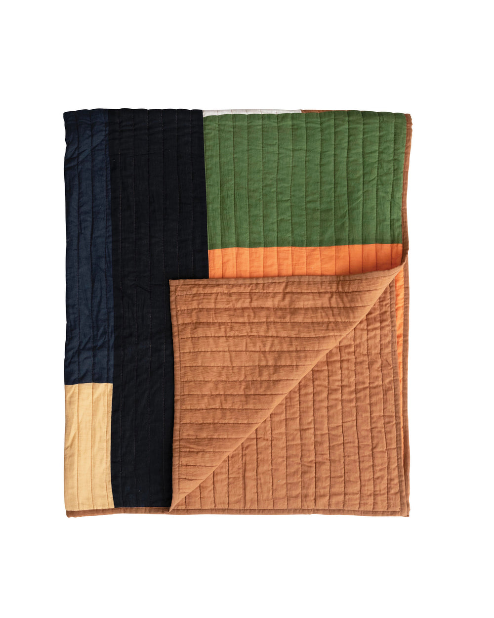 Colcha estilo patchwork 100% algodón reciclado, ideal para decorar espacios en tonos cálidos y tener a mano en caso que el clima se ponga más fresco. Puedes usarla para cubrir un sillón o sofá, o colocar sobre tu cama.