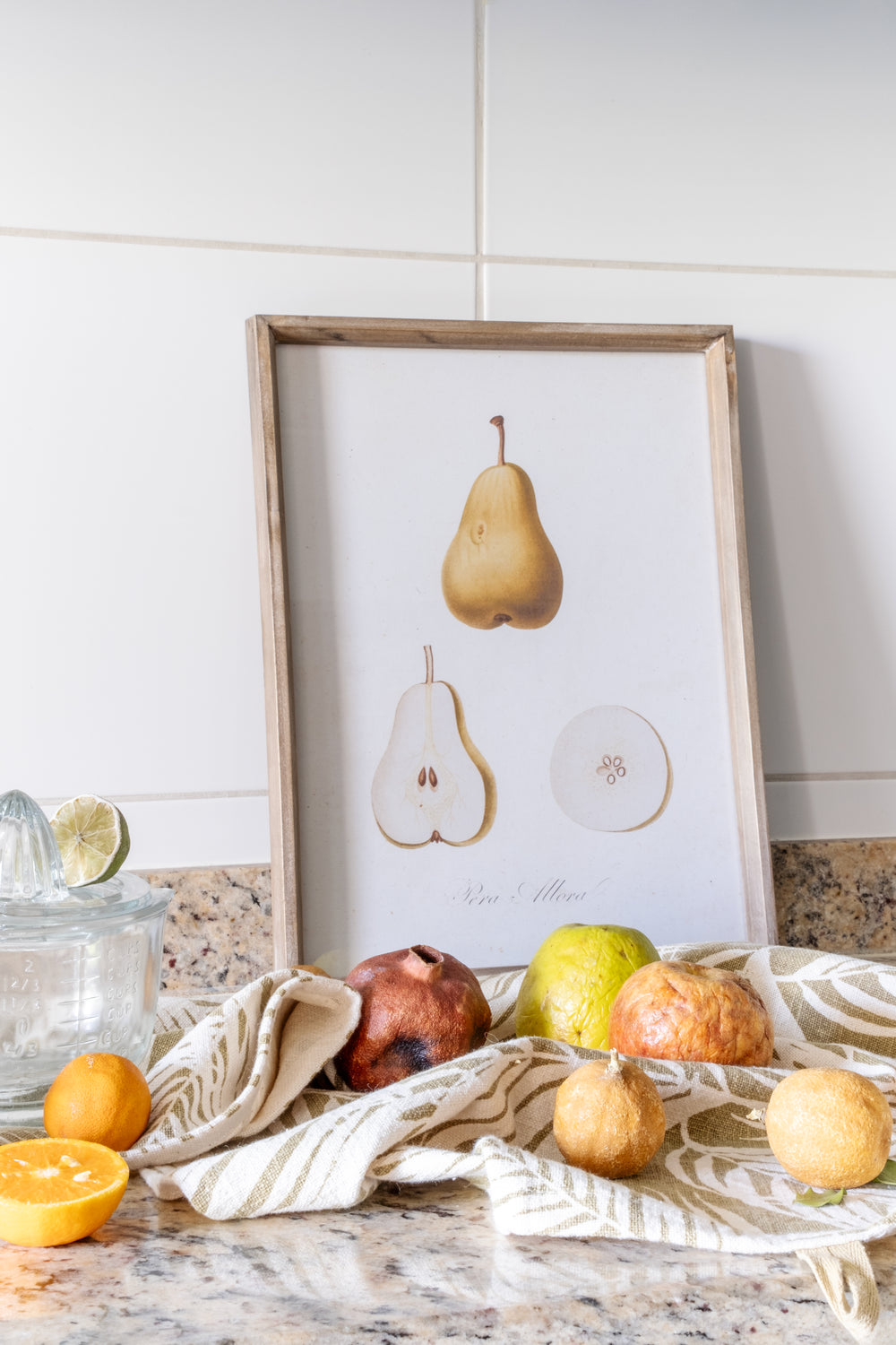 Este conjunto de cuadros de inspiración vintage presenta 9 estilos de estampados frutales en marcos de madera. Haz una composición con tus favoritos y ponlos en la cocina, comedor o dando un toque vintage a una entrada.