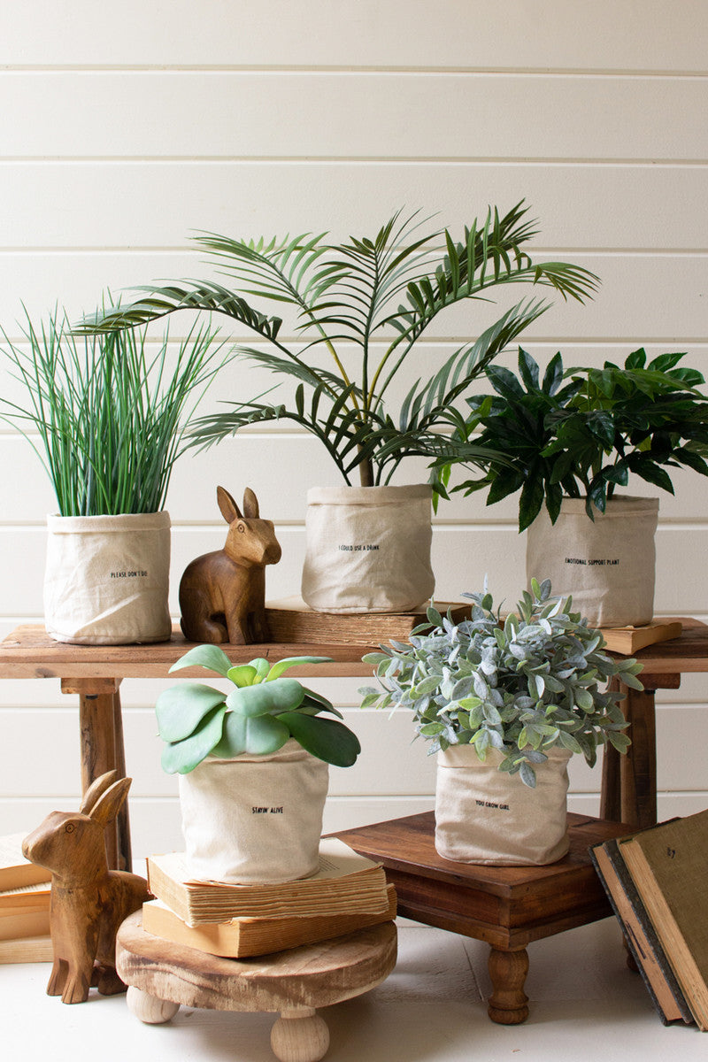 Portamacetero de tela de algodón, con frases inspiradas en los amantes de las plantas. Estos cubre maceteros son ideales para darle un poco de humor a tus espacios, y también para cambiar el look en caso de que no te guste como se ven tus maceteros. Vienen con forro plástico en su interior, para evitar que se deteriore con el riego o tierra.