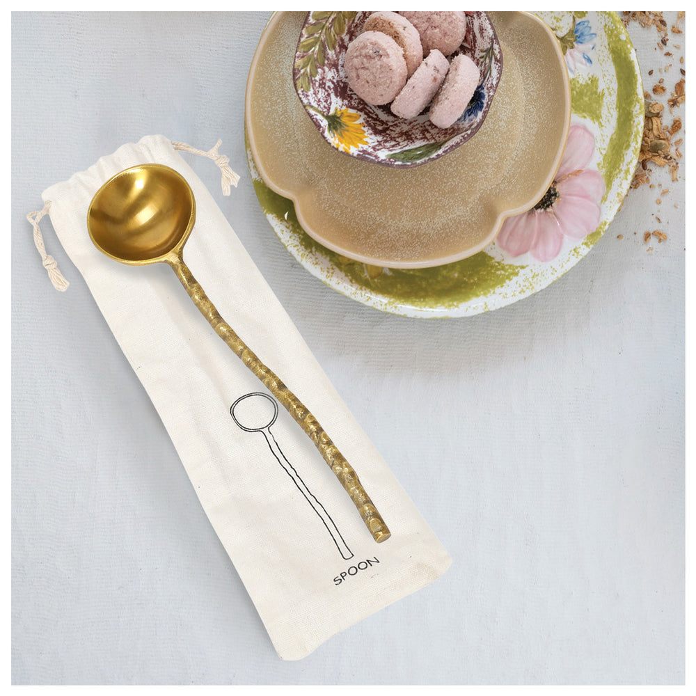 Esta moderna cuchara para servir de latón cuenta con un mango martillado y una bolsa con cordón estampada. Un toque brillante y estiloso para servir en la mesa.