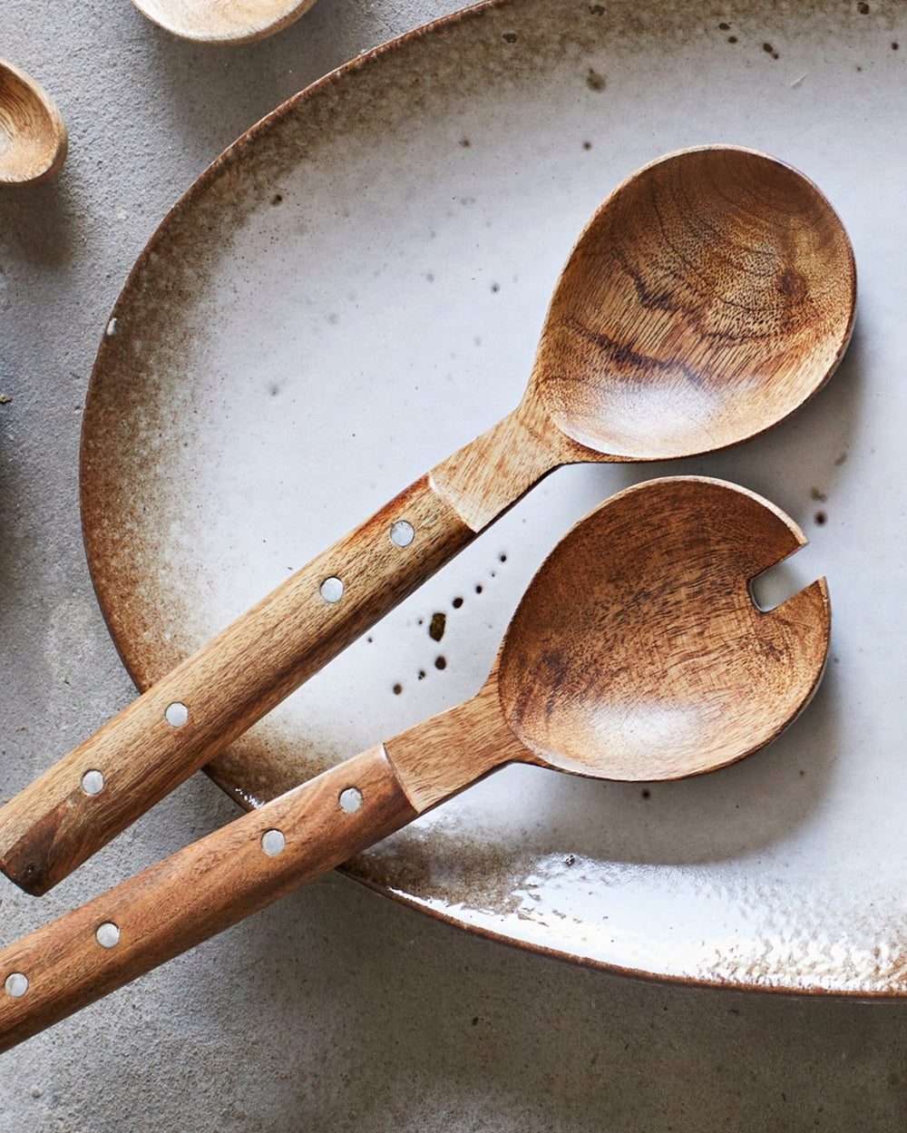 Este set de cucharas para servir, hecho de madera de mango y remaches metálicos tiene una terminación rústica que va con una mesa estilosa y original.