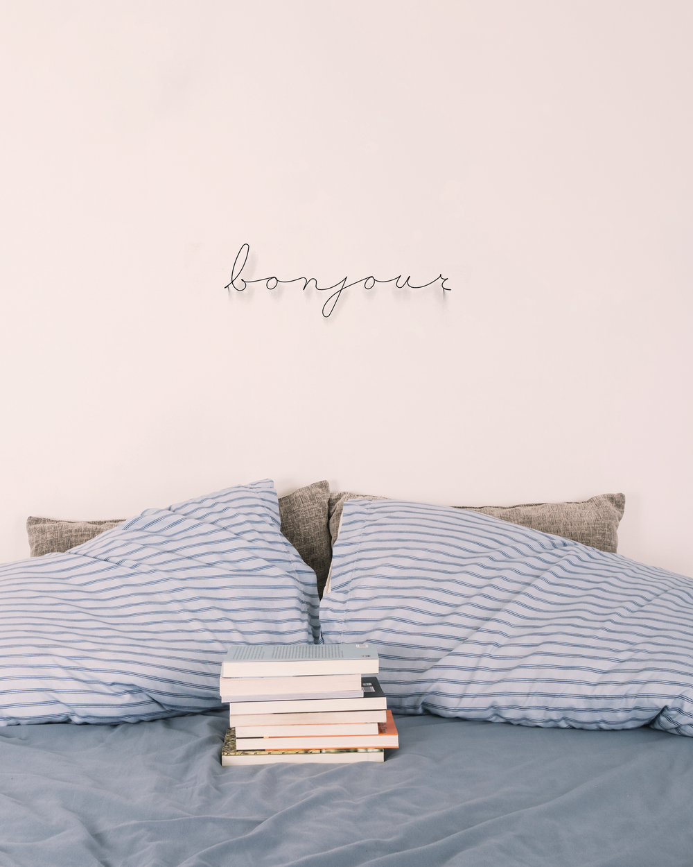 Colocar la escultura en la pared y marcar dónde estarán los dos extremos de las puntas. Hacer un pequeño orificio con un chinche o pin, para paredes blandas, o usar la punta más pequeña de un taladro para paredes duras. Insertar la palabra suavemente. Dejar una distancia entre la palabra y el muro para permitir que se proyecte una sombra.