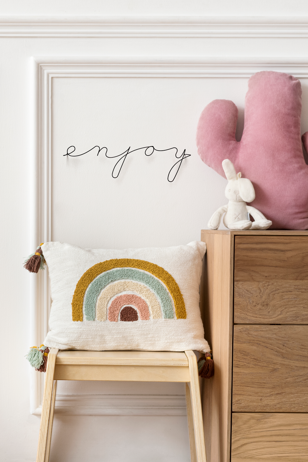 Colocar la escultura en la pared y marcar dónde estarán los dos extremos de las puntas. Hacer un pequeño orificio con un chinche o pin, para paredes blandas, o usar la punta más pequeña de un taladro para paredes duras. Insertar la palabra suavemente. Dejar una distancia entre la palabra y el muro para permitir que se proyecte una sombra.