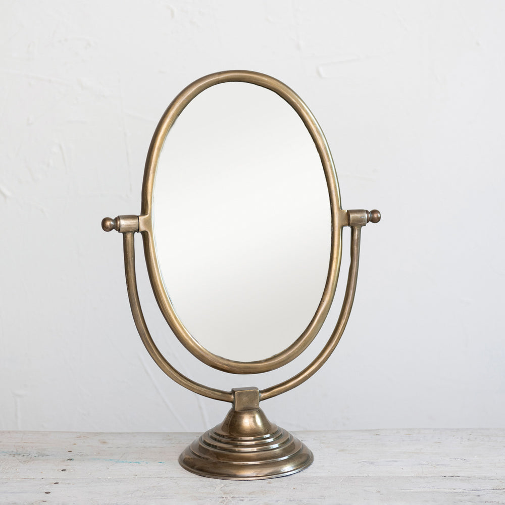 Este espejo de tocador giratorio de aluminio antiguo de latón añade un toque de estilo personal a una repisa o estantería.