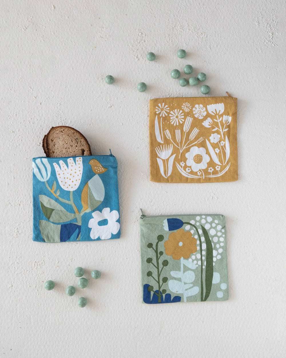 Estuche de tela estampado y revestimiento interior para alimentos. Ideal para reemplazar las bolsas de plástico, para llevar colaciones en tu mochila o bolso.