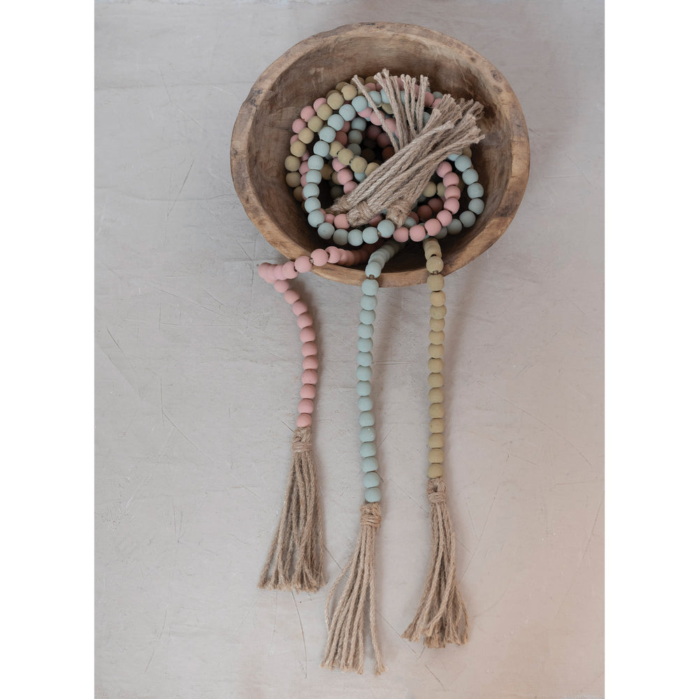 Guirnalda de madera pintada en tonos pasteles y borlas de yute. Añade un toque decorativo extra al colgarlo de la esquina de un espejo o marco de fotos, o enrollada alrededor de un jarrón, sobre un libro, etc. las posibilidades son infinitas.