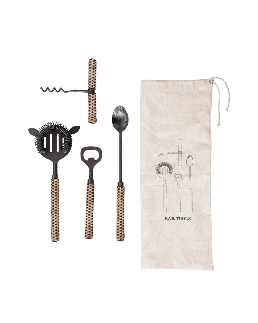 Juego de accesorios para coctelería de acero inoxidable y rattan.