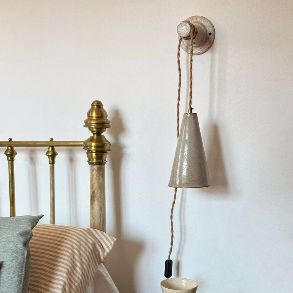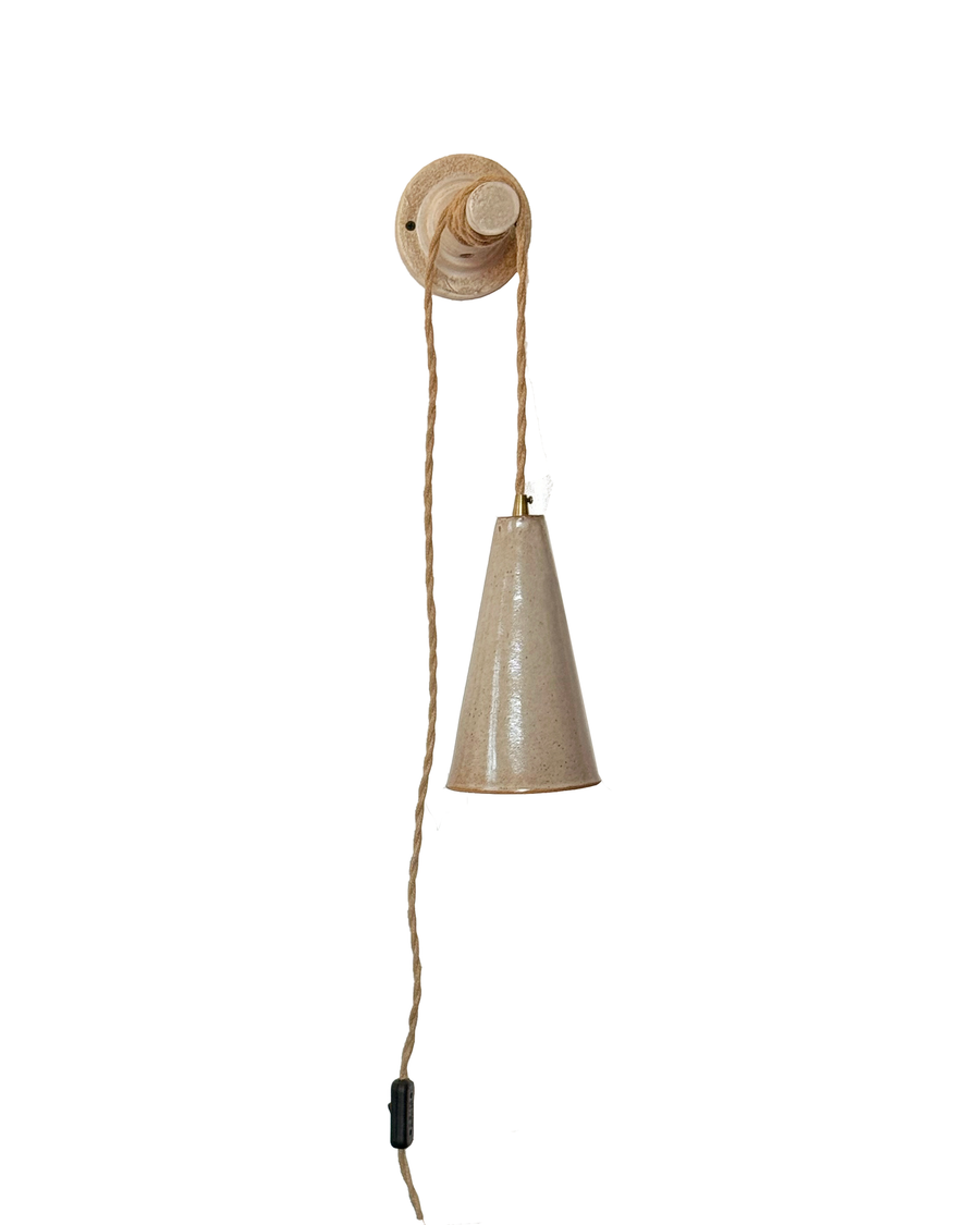 Lámpara de Muro de Cerámica gres color gris perla, incluye soporte de muro de cerámica y cable trenzado de yute natural con interruptor y enchufe.