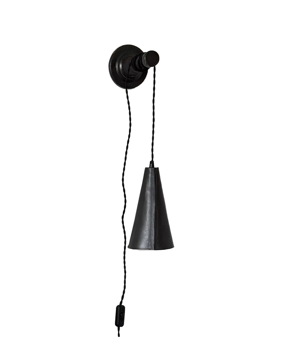 Lámpara de Muro de Cerámica gres color negro, incluye soporte de muro de cerámica y cable trenzado color negro con interruptor y enchufe.