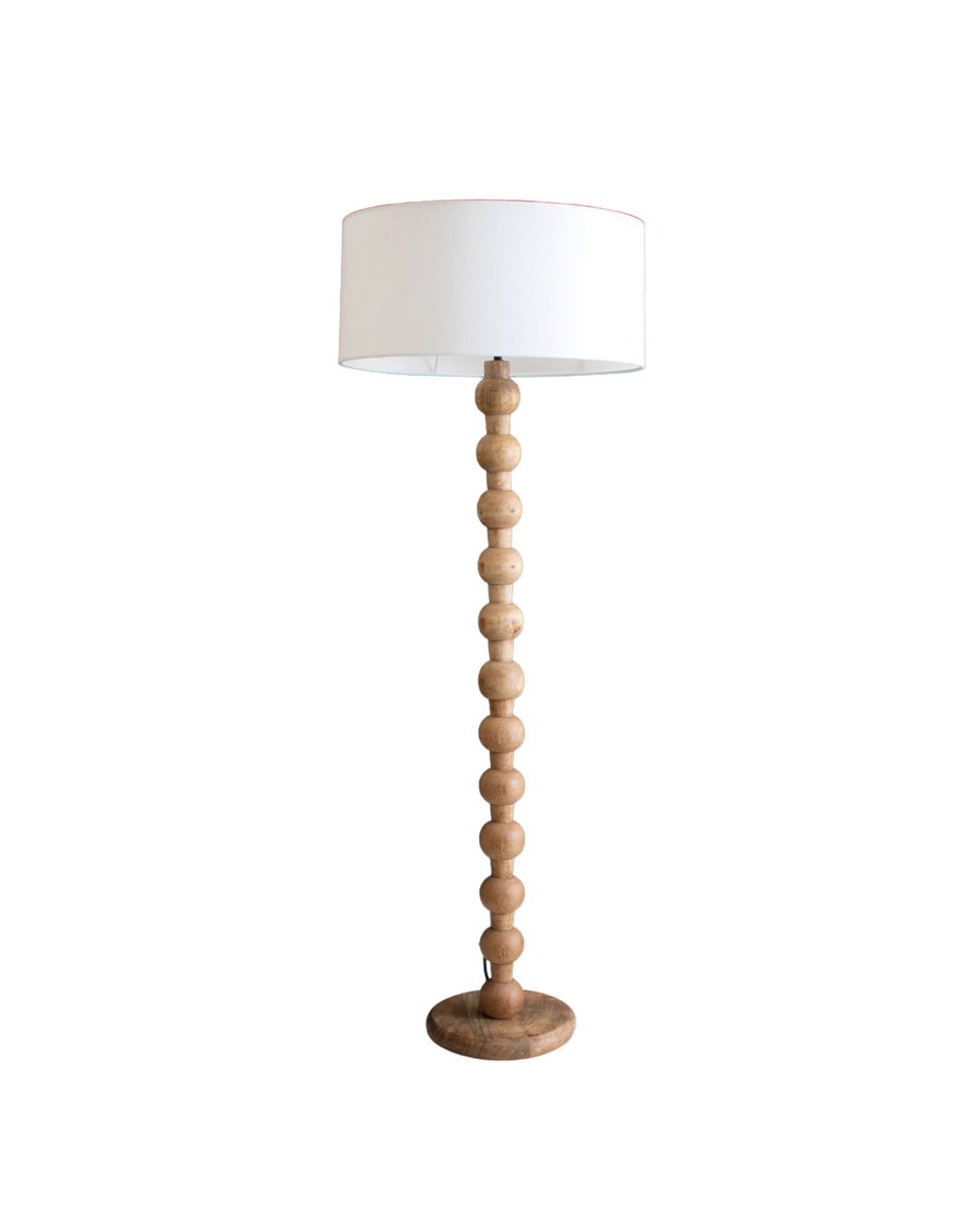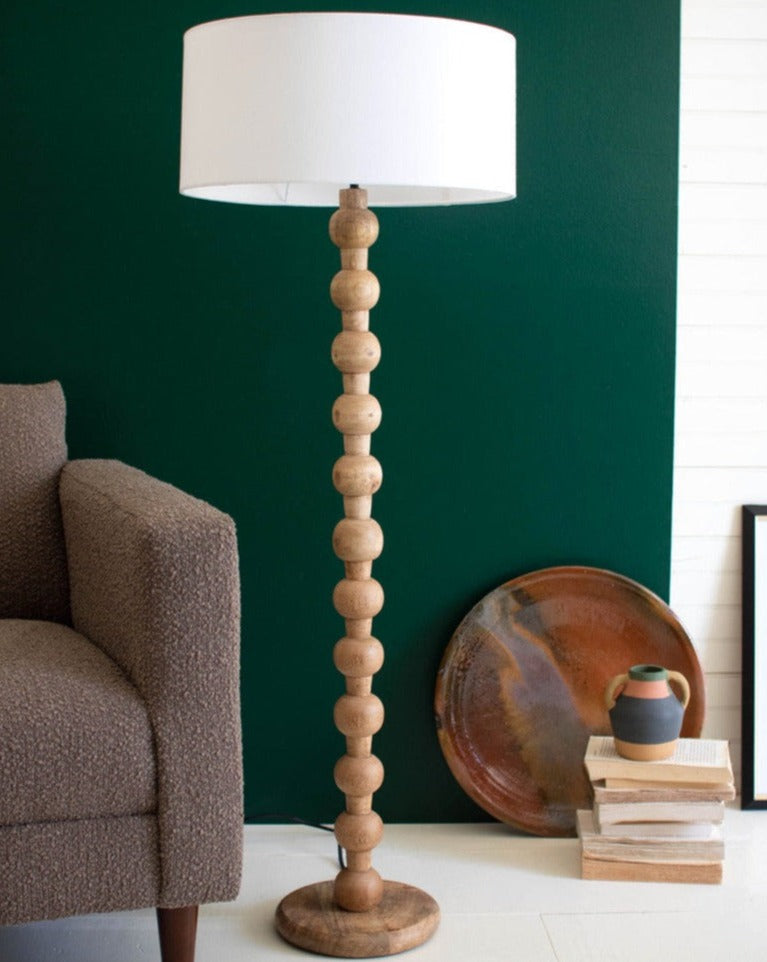 Esta maravillosa lámpara de la India está hecha de madera torneada y tiene una pantalla redonda blanca.