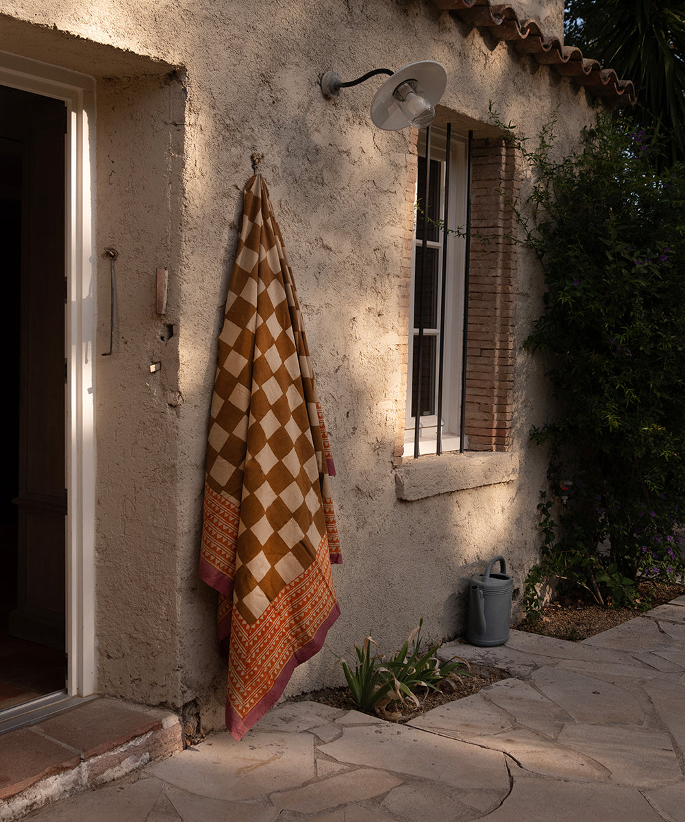 Descubre la belleza del mantel Checkmate, meticulosamente impreso a mano con el arte de bloques de madera tallados.