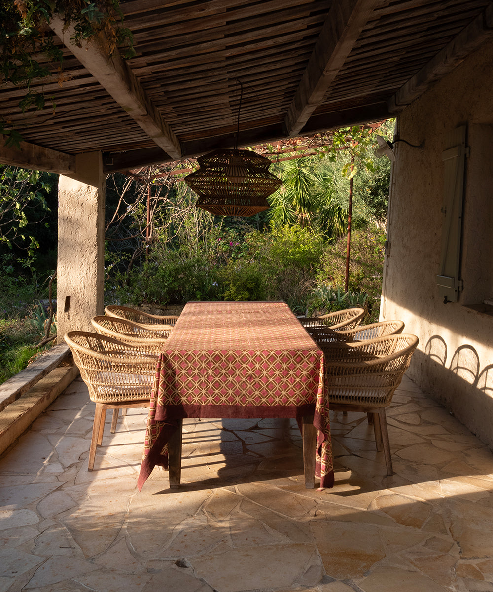 Sumérgete en la grandeza del mantel Helena: un lienzo más grande de felicidad en burdeos, rosa y tonos mostaza, meticulosamente impreso a mano con el arte de bloques de madera tallados.