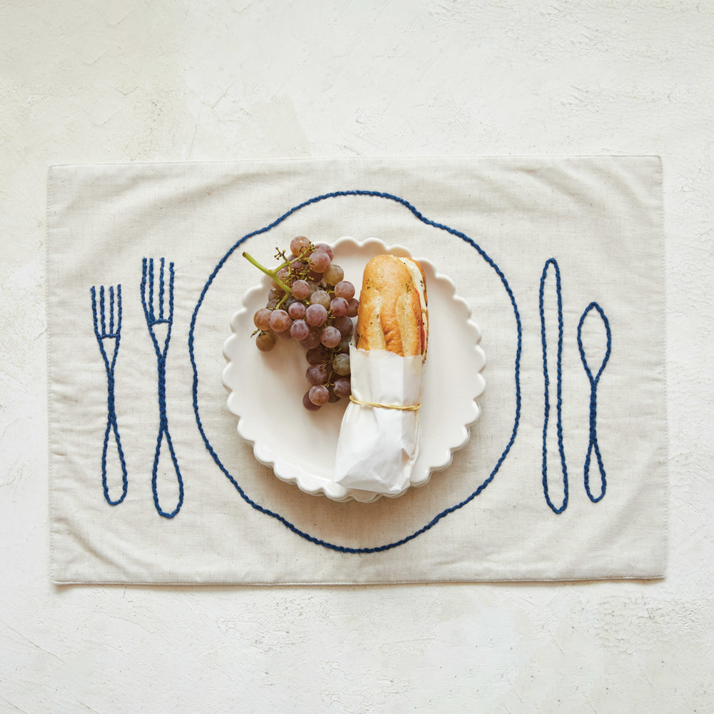 Este individual rectangular presenta un diseño bordado para la mesa en colores natural y azul marino, el bordado incluye plato, tenedor, cuchillo, cuchara y servilleta. Hecho de una mezcla de algodón y lino, es suave, duradero y fácil de lavar.