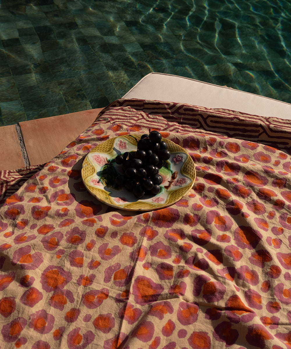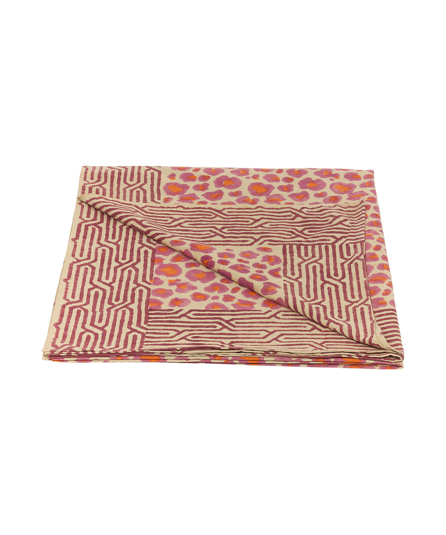 Descubre la belleza del mantel animal print en tonos rosa con toques de lila y naranja, meticulosamente impreso a mano con el arte de bloques de madera tallados.
