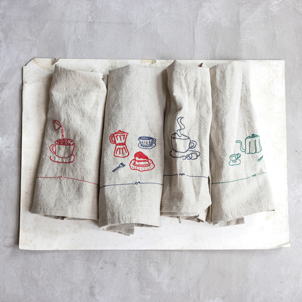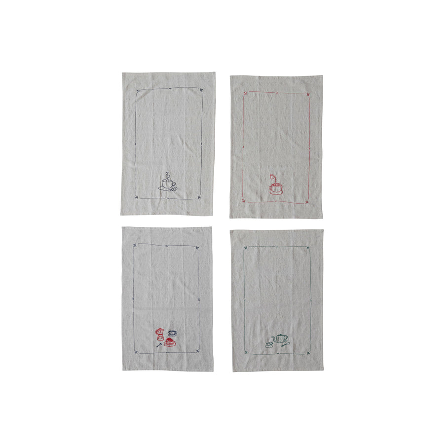 Paño de cocina de algodón bordado con 3 estilos diferentes. Elige entre distintas escenas que incluyen té y café o simplemente haz la combinación perfecta con todos.