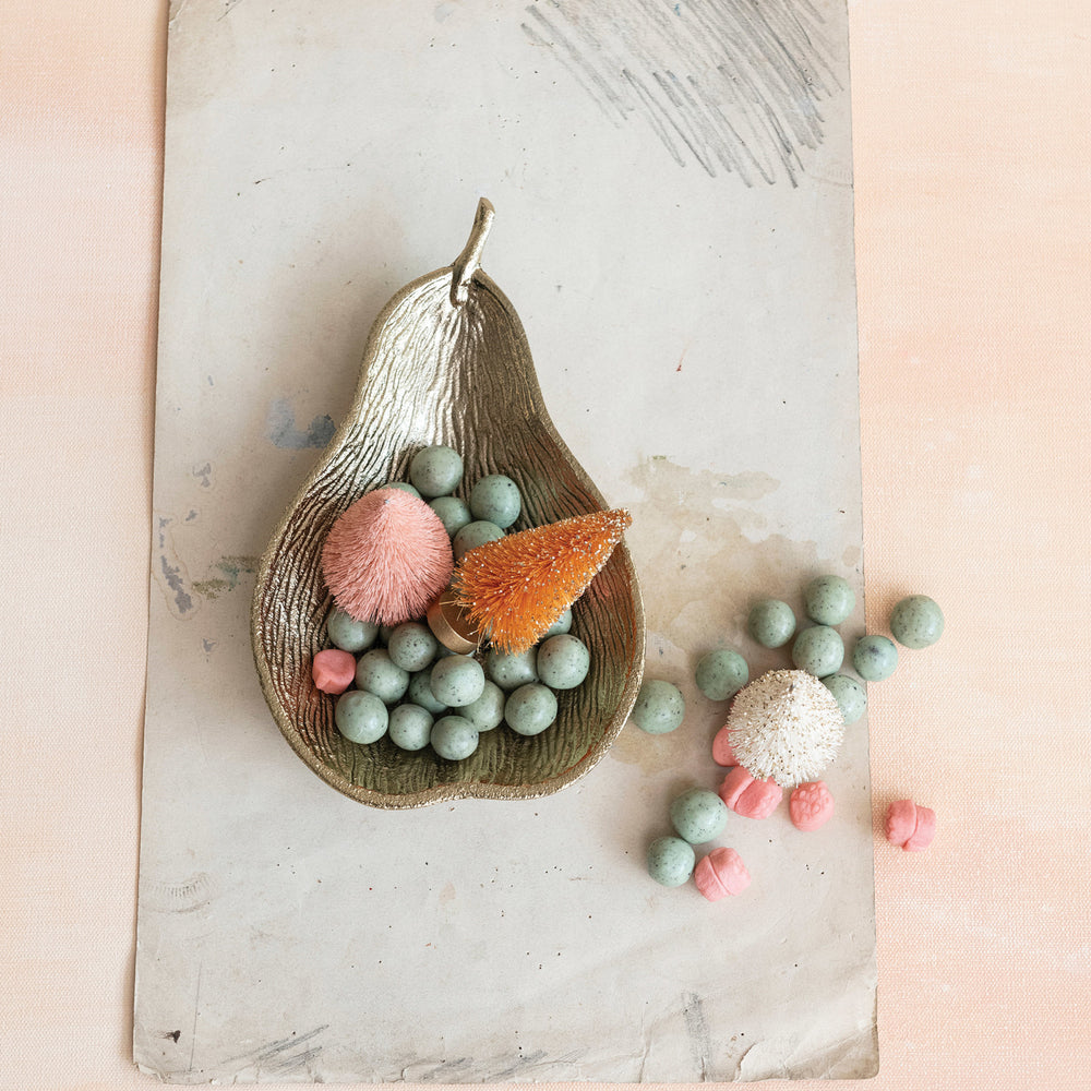 Con su radiante terminación dorada, este plato con forma de pera es una adición perfecta para cualquier lugar. Es de aluminio apto para poner comida, así que si quieres usarlo en la mesa con algo encima, se verá bien para ocasiones especiales o para uso diario.