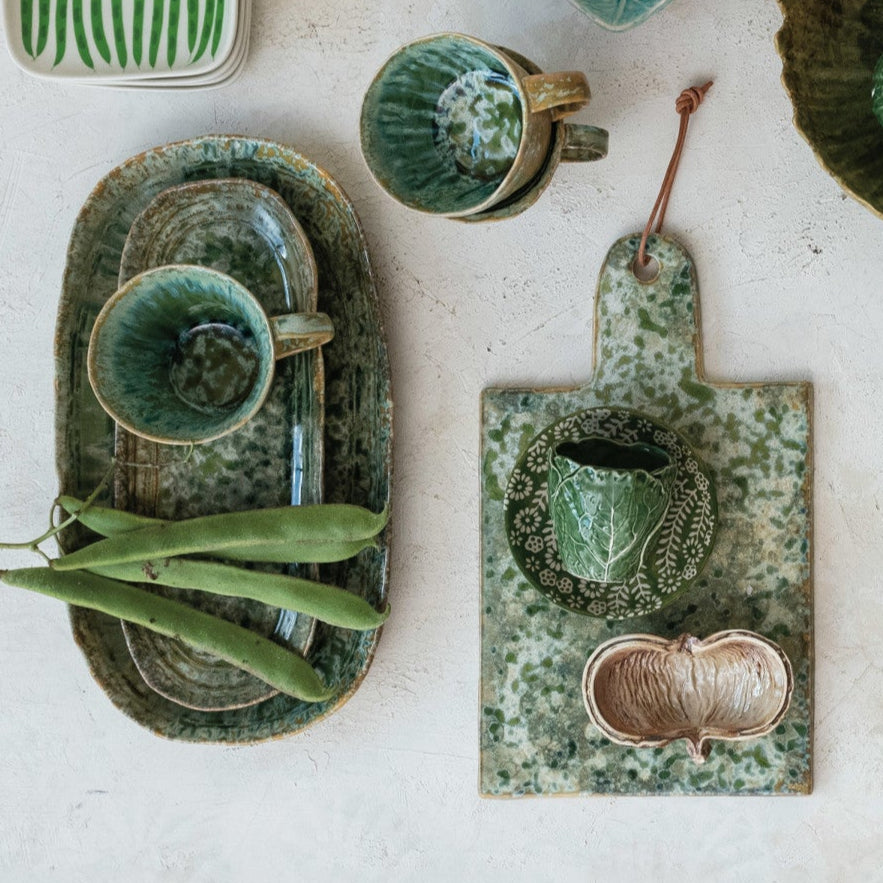 Este plato está elaborada con gres, un material natural que se cuece a altas temperaturas y tiene un cuerpo denso y duradero. Tiene un color verde mate que varía con cada pieza, creando un aspecto rústico y acogedor.