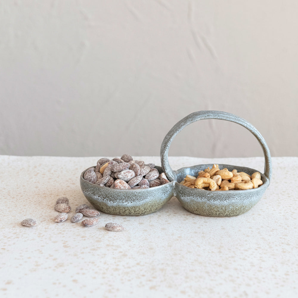 Este plato doble de cerámica esmaltada con asa es un complemento bonito y práctico para cualquier hogar. Tiene un acabado de esmalte reactivo en color gris verdoso, que le da a cada pieza un aspecto único y rústico. Se puede utilizar para servir una variedad de alimentos, desde salsas y vegetales hasta postres, o para exhibir frutas, nueces o dulces en una mesa o mostrador. También se puede meter en el microondas, el horno y el lavavajillas para un uso fácil y cómodo.