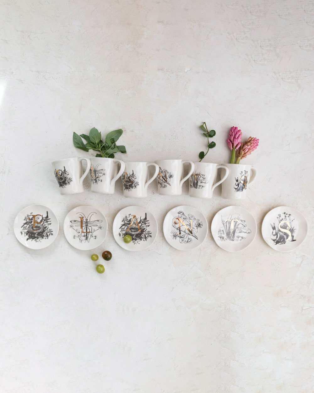 Plato redondo de cerámica en tono blanco, con dibujos de naturaleza y letra en tono dorado.