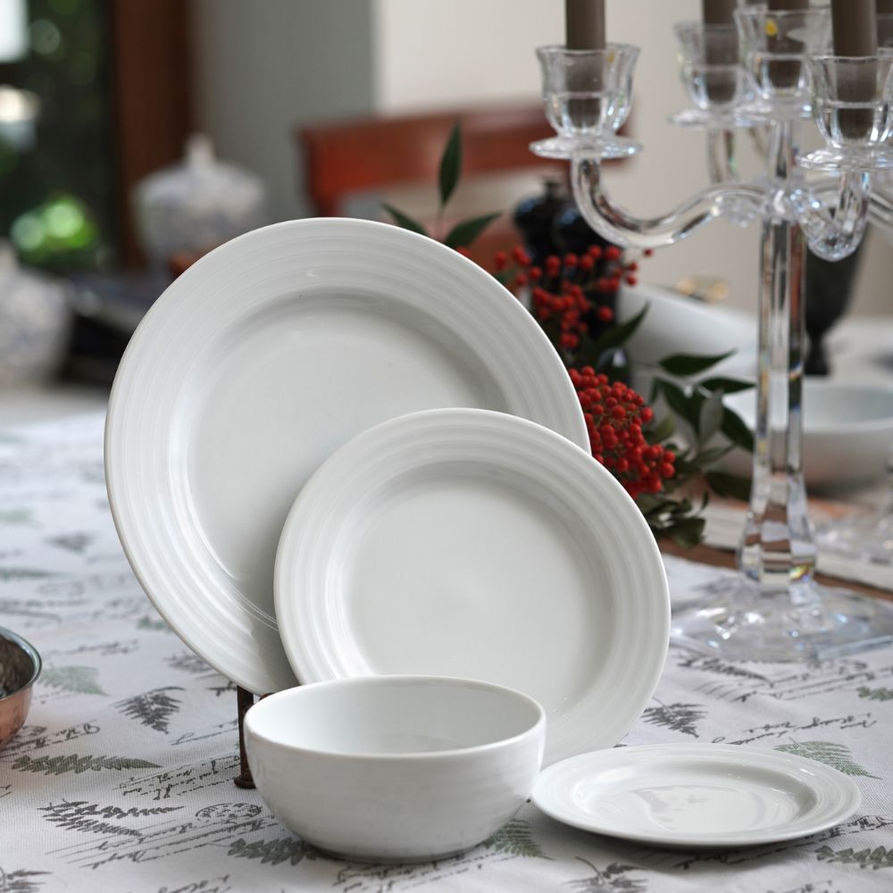 Contiene: 6 platos de comida (27 cm), 6 platos de ensalada o postre (21 cm), 6 platos de pan (16 cm) y 6 platos de sopa (15 cm de diámetro y 640 cc)