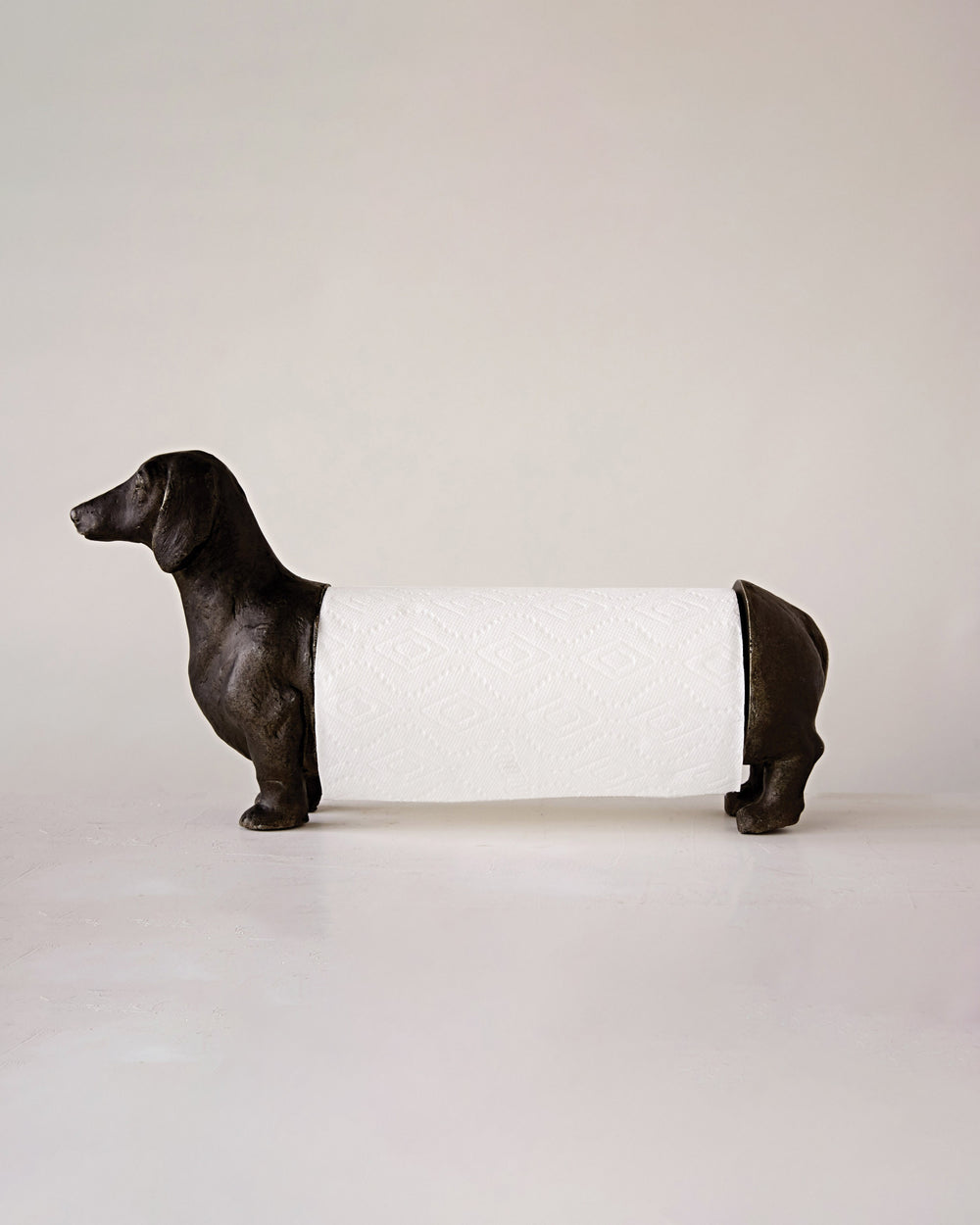 Este portarollos de papel de perrito salchicha le quitará todo aburrimiento a tu cocina. Fácil de usar, dado que extensible, por lo que se ajusta a toallas de papel de diferentes alturas. Es de color negro con un leve brillo plateado.