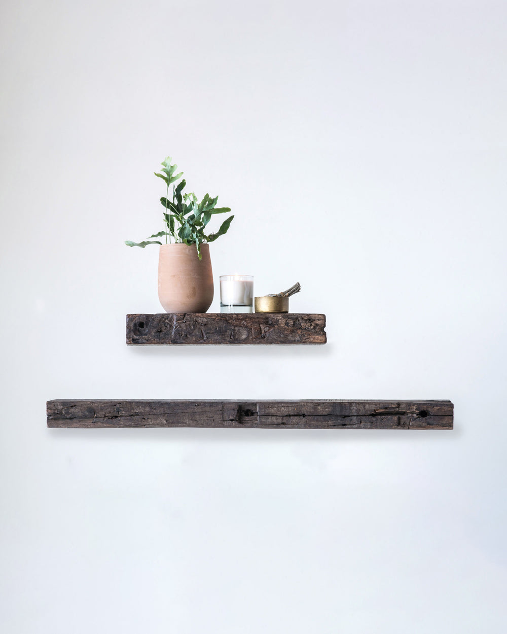 Repisa flotante de madera restaurada en tono oscuro. Esta repisa añade un toque rústico a tus espacios.