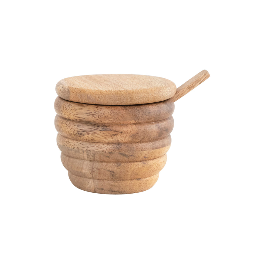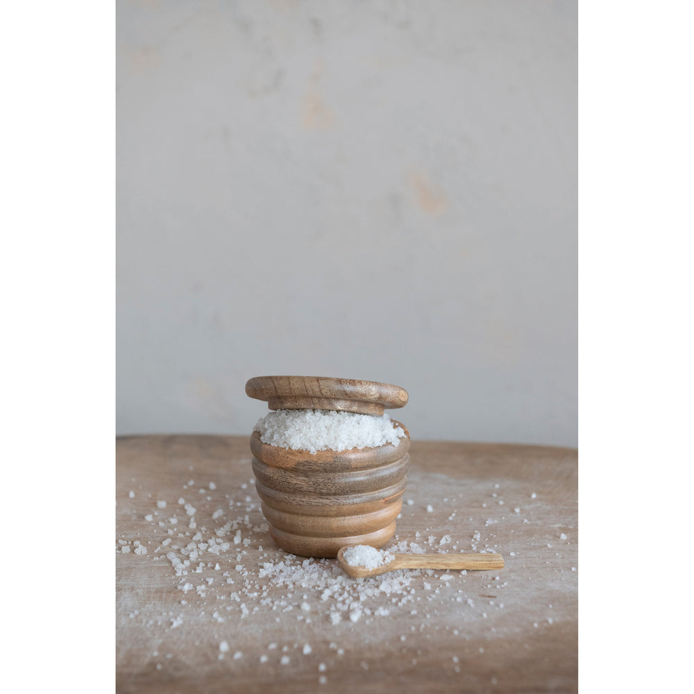 Salero de madera con tapa y cucharita, es perfecto para almacenar y exhibir sales, azúcar o especies y servir directamente en la mesa, en un asado, o mientras cocinas.