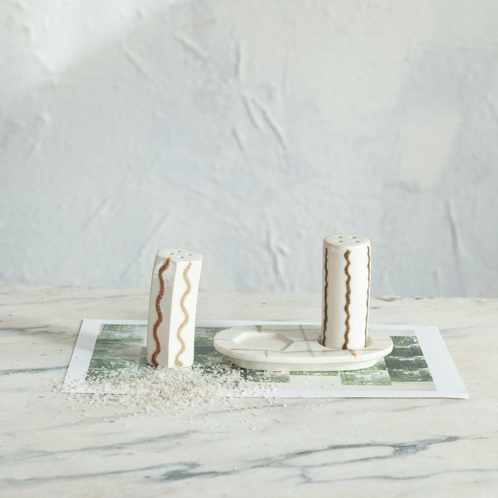 Este exquisito set de salero y pimentero, es un testimonio del arte de la cerámica artesanal. Cada salero presenta un distintivo diseño cuadriculado, realzado por un esmalte craquelado que garantiza que no haya dos piezas exactamente iguales.