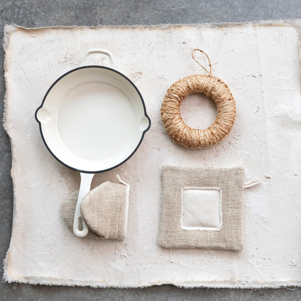 Posaollas (Trivet o salvamantel) de yute con forma de aro y asa para colgar.