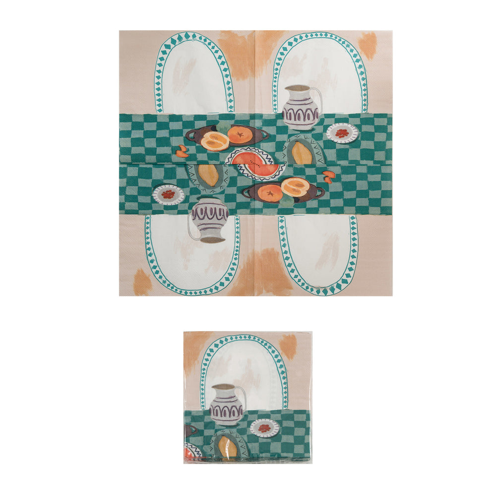 Juego de 50 servilletas de papel con diseño de jarra sobre mesa. La servilleta desechable, biodegradable y fácil de limpiar presenta una jarra blanca con rayas azules llena de flores de colores, dispuesta sobre una mesa de madera con un mantel a cuadros.
