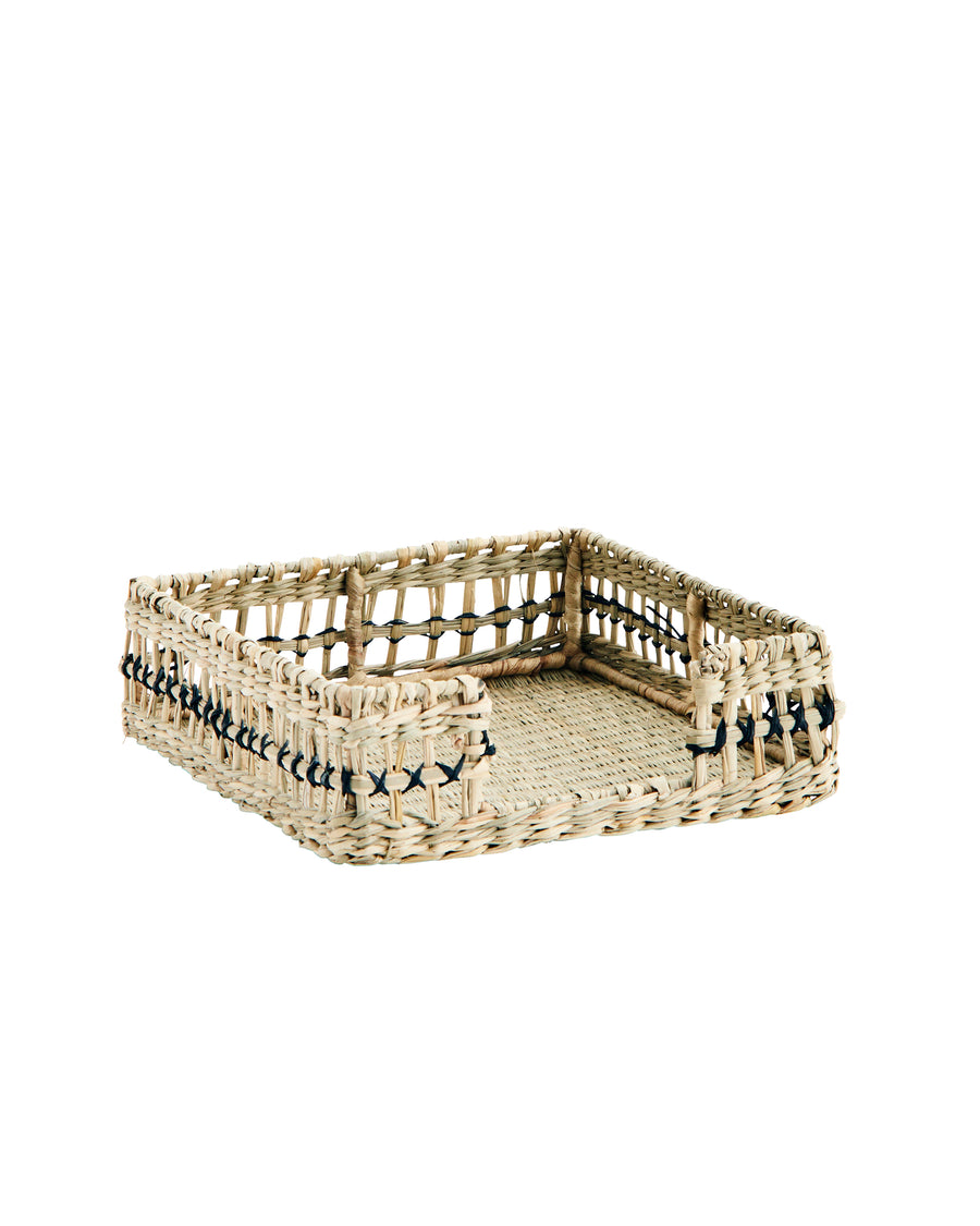 Lleva tus servilletas a la mesa o a tu quincho para un asado en este lindo y delicado servilletero de seagrass natural con un toque de cruces negras en el centro.