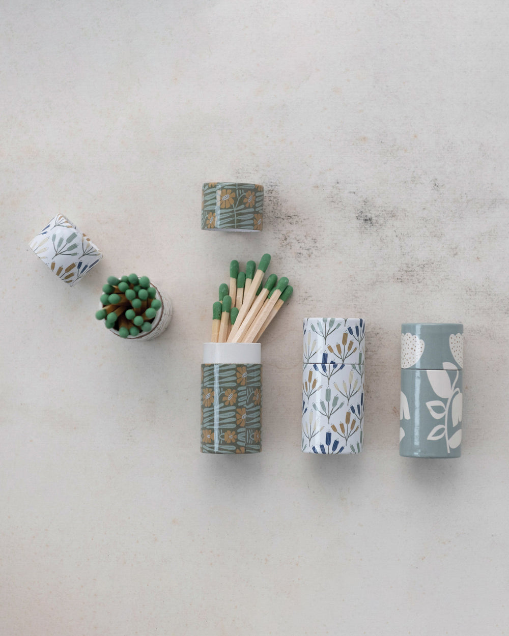 Fósforos de madera en tubo con dibujo floral, para darle un toque especial a tu cocina, parrilla o llevar en tus panoramas al aire libre. Disponible en 3 diseños.