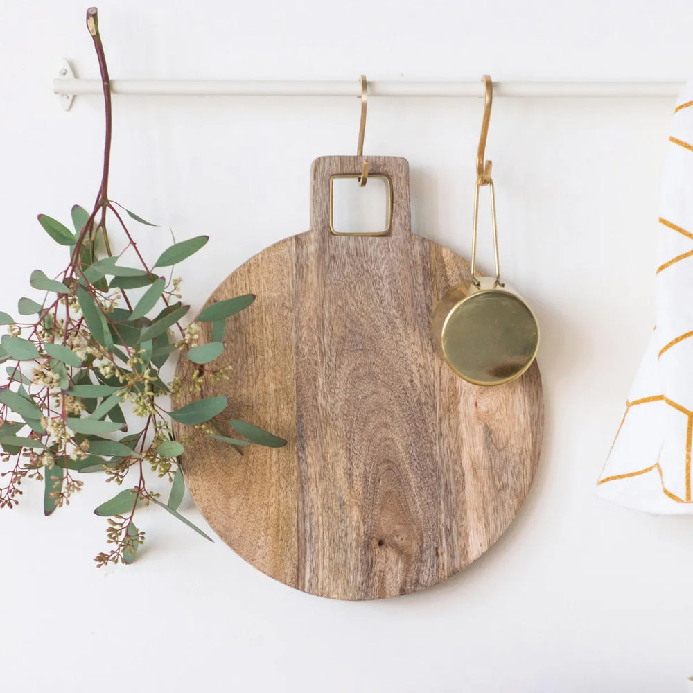 Corta en cubitos tu comida favorita con confianza con esta tabla de cortar de madera de mango y latón. Fabricada con madera de mango y adornos de latón en el interior del mango, esta tabla de cortar proporciona una superficie de corte duradera y resistente que protege las encimeras de tu cocina y la decora. También la puedes llevar a la mesa para un picoteo o para llevar el pan a un brunch casero.