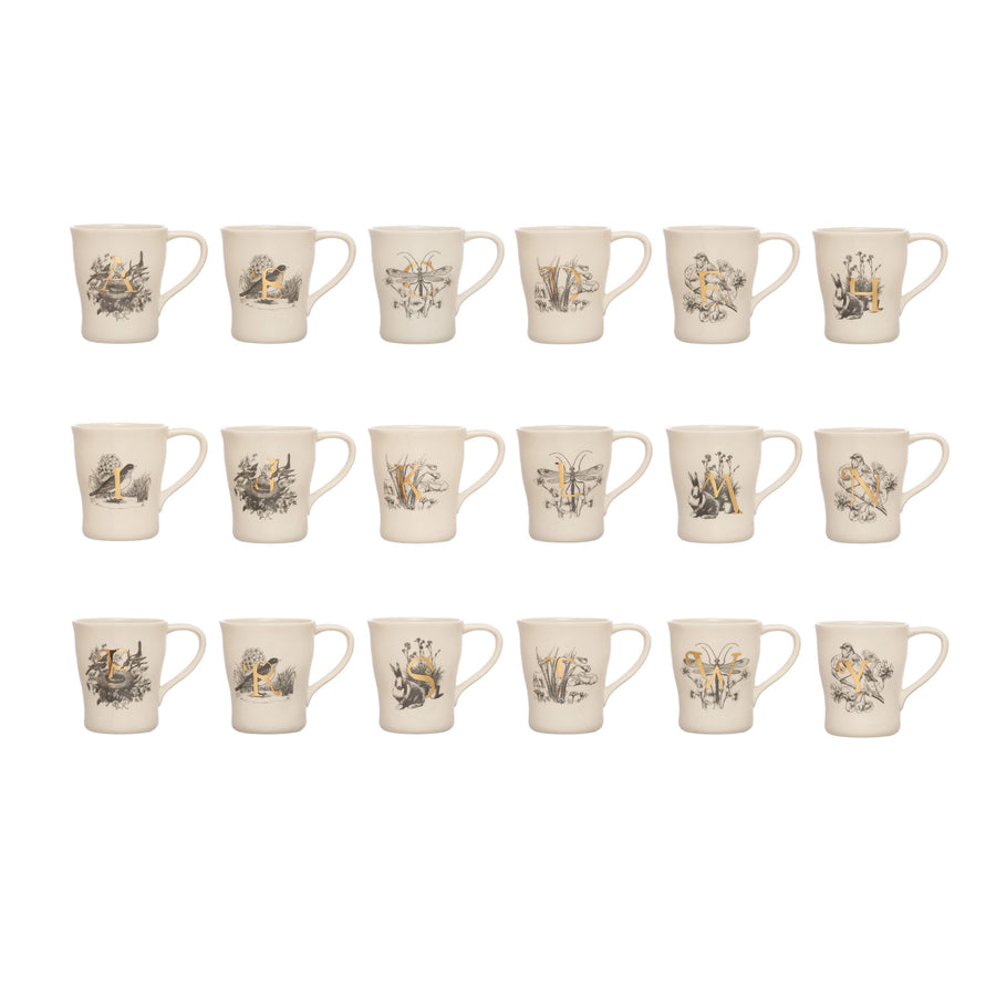 Taza de cerámica en tono blanco, con dibujos de naturaleza y letra en tono dorado.