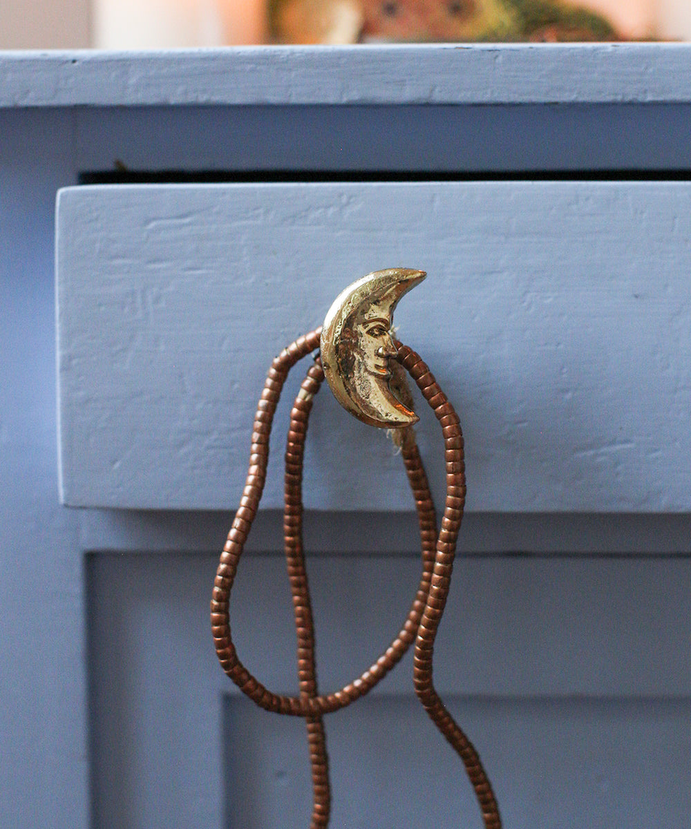 Tirador dorado con forma de luna, ideal para hacer par en una cómoda o de forma individual en cajoneras.