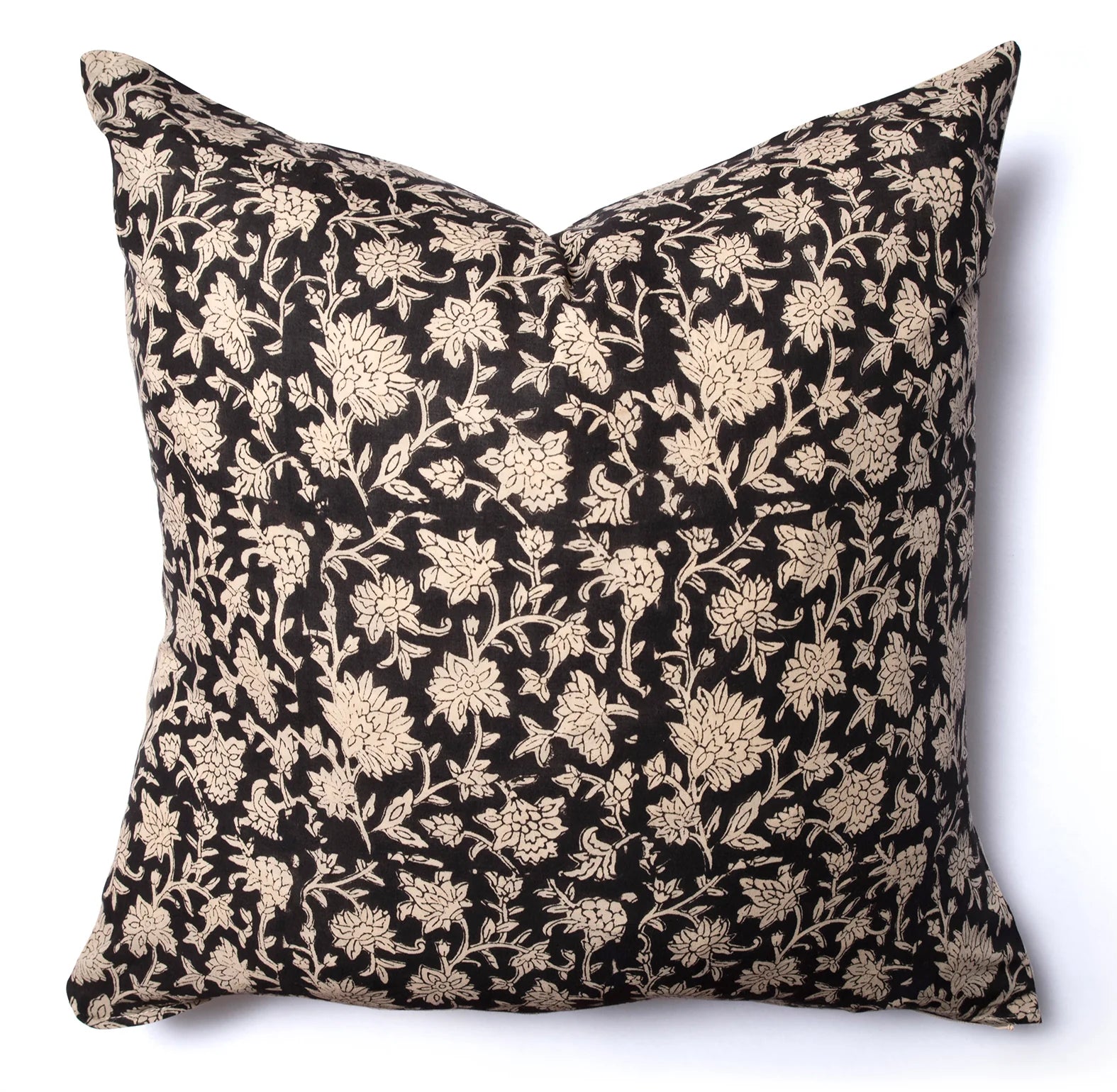 Nil es una funda de cojín de color negro con flores crudo por delante y sólido color crudo por atrás. Estampado a mano con bloques de madera, sobre algodón suave, ligero y de calidad premium.