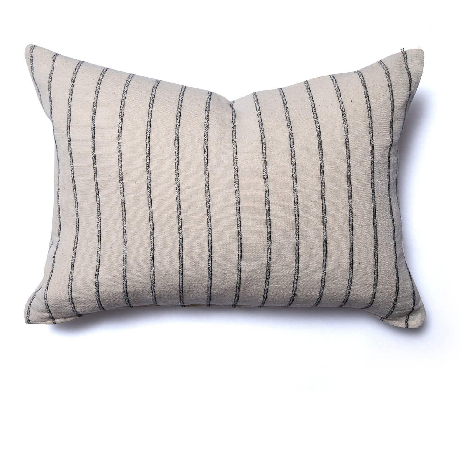 Biel Negro Lumbar es una funda de cojín color crudo con rayas negras por delante y sólido crudo por atrás. De algodón de peso medio su diseño fue tejido por artesanos expertos en Tailandia.