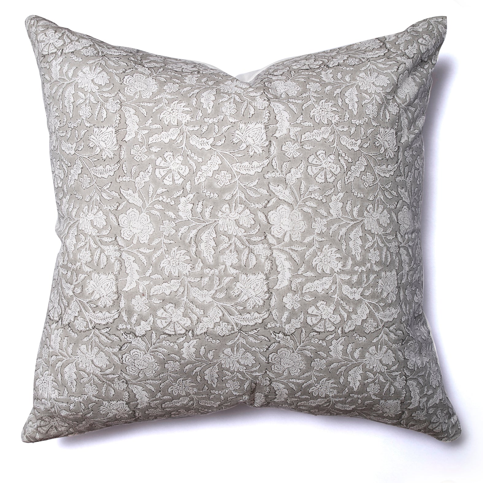 Pau es una funda de cojín color gris con flores color crudo por delante y sólido color crudo por atrás. Estampado a mano en India, con técnica de bloques de madera sobre algodón premium.