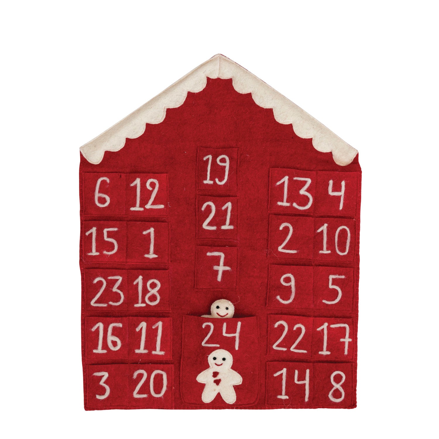 Cuenta atrás para Navidad con este calendario de adviento de fieltro de lana hecho a mano en rojo y blanco para colgar en la pared con una figura de pan de jengibre. Agrega un toque de magia a las decoraciones festivas con nuestra impresionante colección de adornos para pared, que presentan siluetas navideñas familiares, perfectas para celebrar la temporada con estilo.