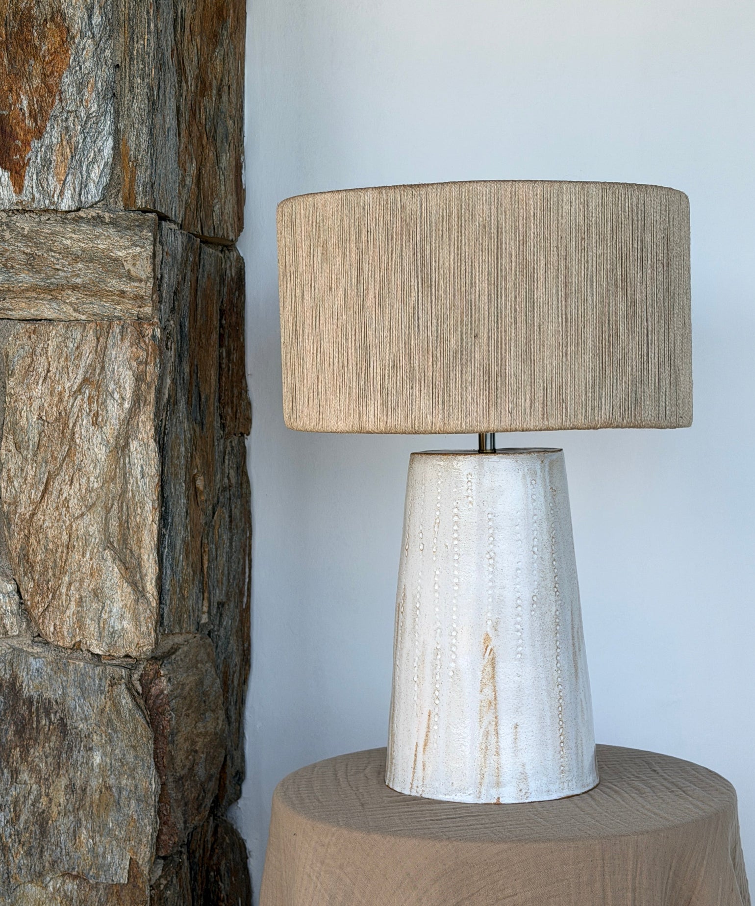 Lámpara de cerámica gres esmaltada en blanco con suaves tonos tierra y pantalla de yute natural. Diseño artesanal que aporta calidez y textura a cualquier espacio.