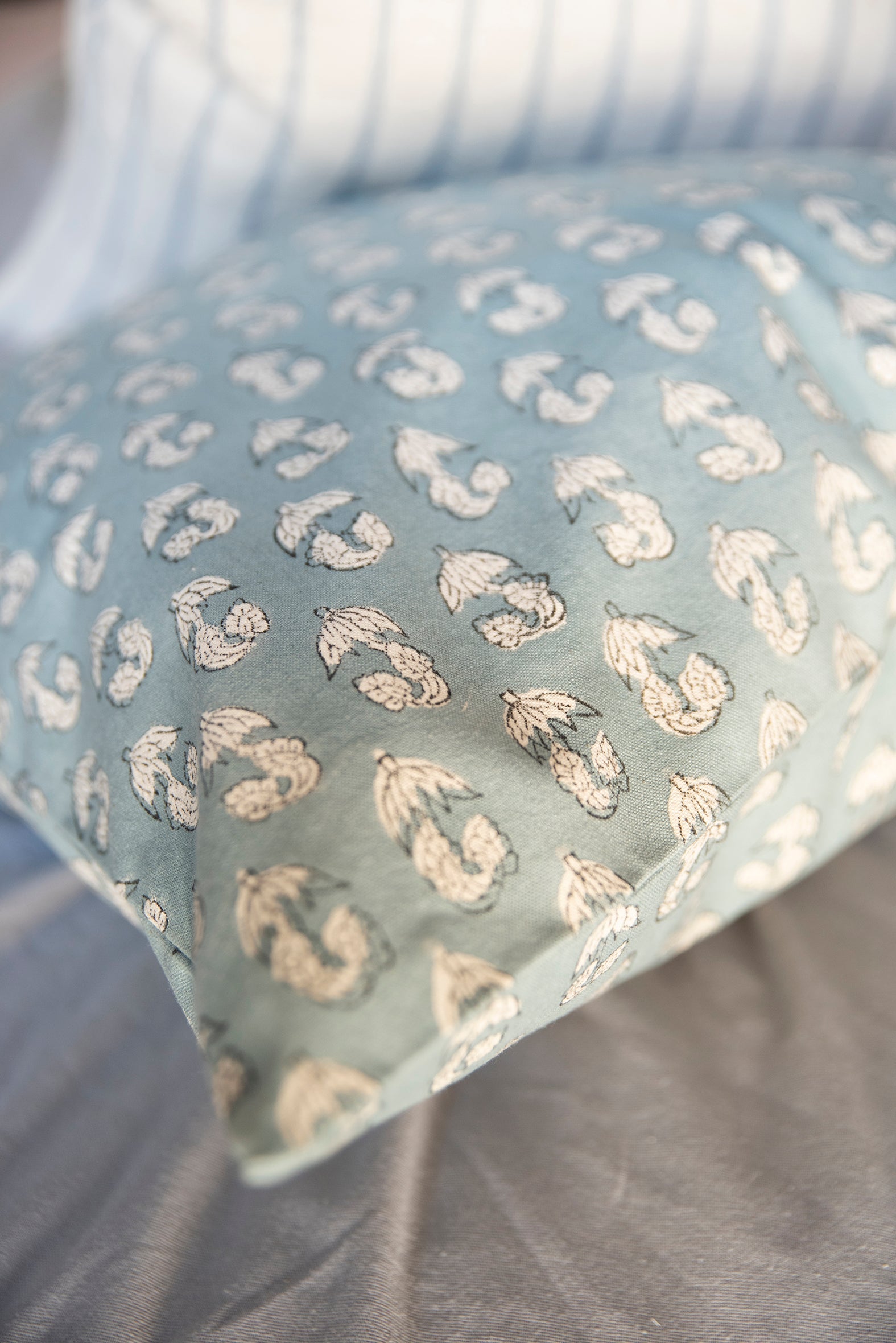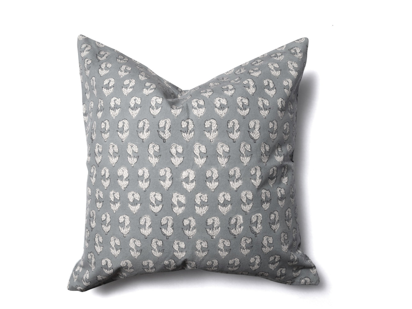 Blau es una funda de cojín gris azulado con flores crudo por el frente y sólido color crudo por atrás. Estampado a mano en India con técnica de bloques de madera, sobre una tela de algodón grueso premium.