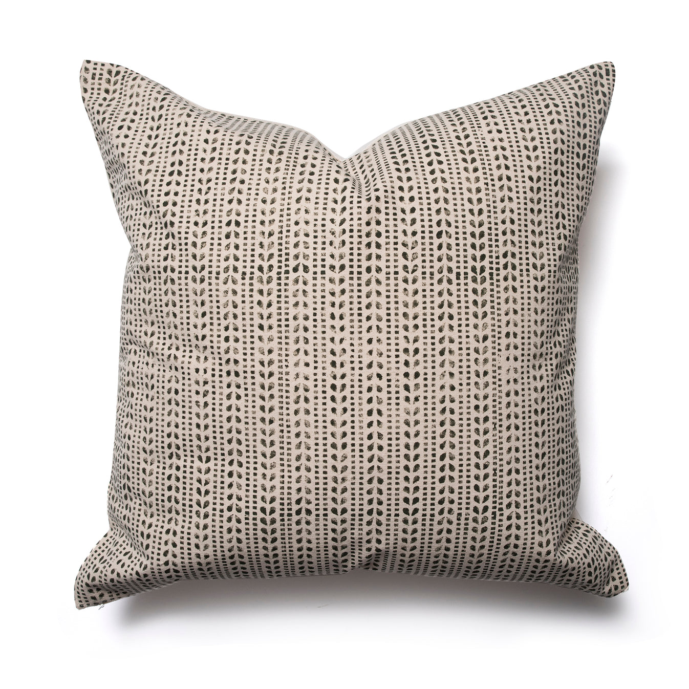 Chloé es una funda de cojín color crudo con un patrón de hojas verdes por delante y sólido color crudo por atrás. Estampado a mano en India, con técnica de bloques de madera sobre algodón grueso premium.